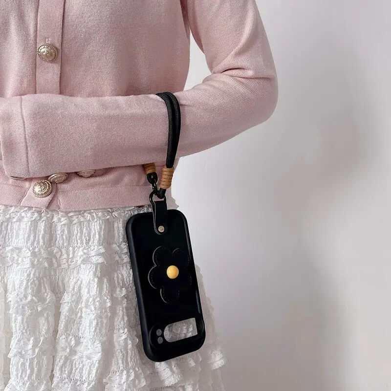 A stitched flower-shaped grip sits centered on the back, finished in a leather-style material with a stud at the center. A short wrist lanyard attaches through a reinforced side tab using a metal ring, with a thick woven cord and wrapped ends.