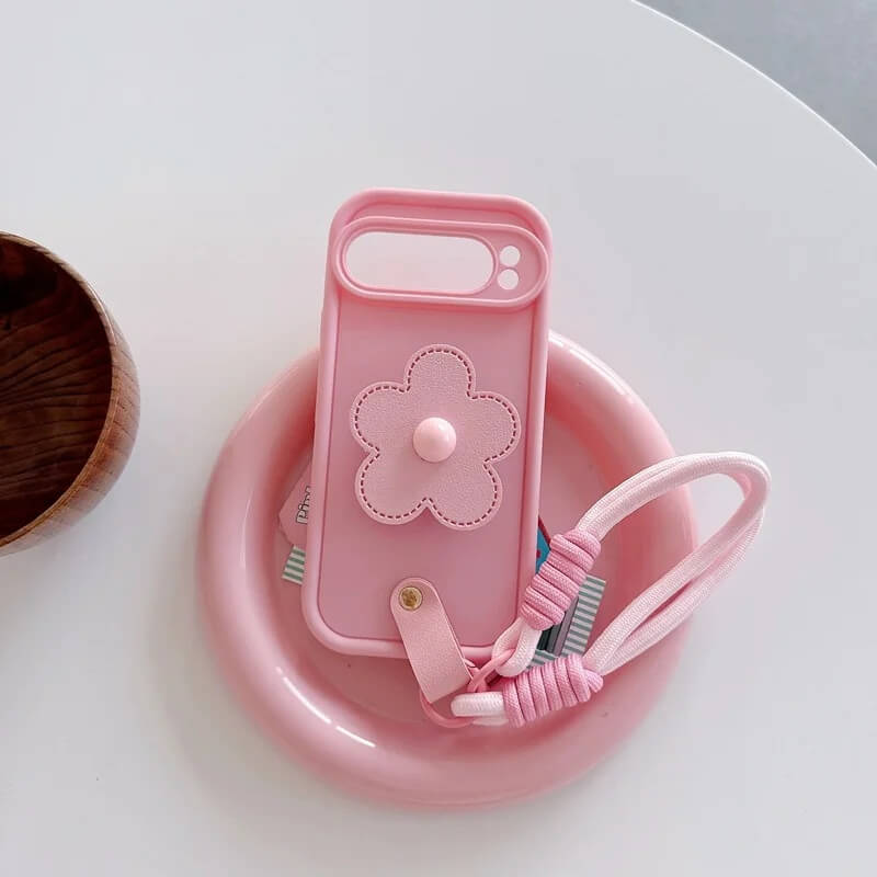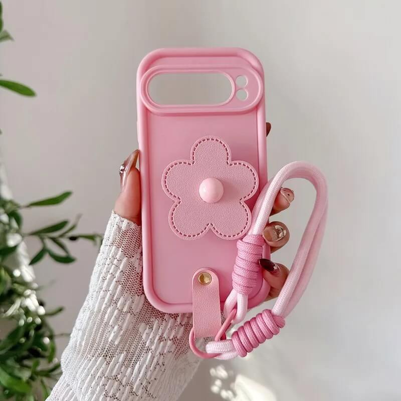 This flower lanyard case uses a soft matte silicone with a smooth surface that wraps cleanly around the Pixel frame. The shape follows the phone closely with accurate openings for the camera, buttons, and ports.