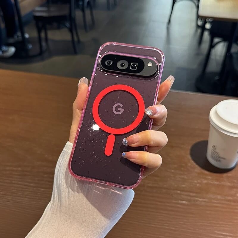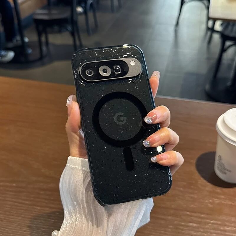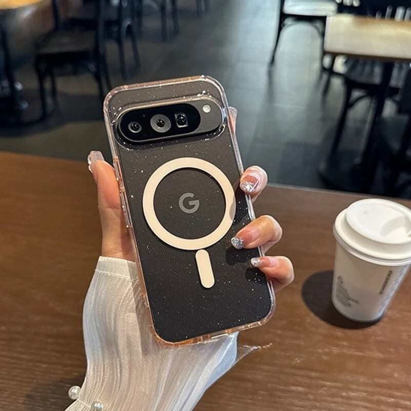 This magnetic pixel case uses a fully transparent body with fine glitter suspended throughout the material. The back remains completely see-through, allowing the phone’s original color and Google logo to stay visible, while a circular magnetic-style ring and vertical bar sit centered on the surface.
