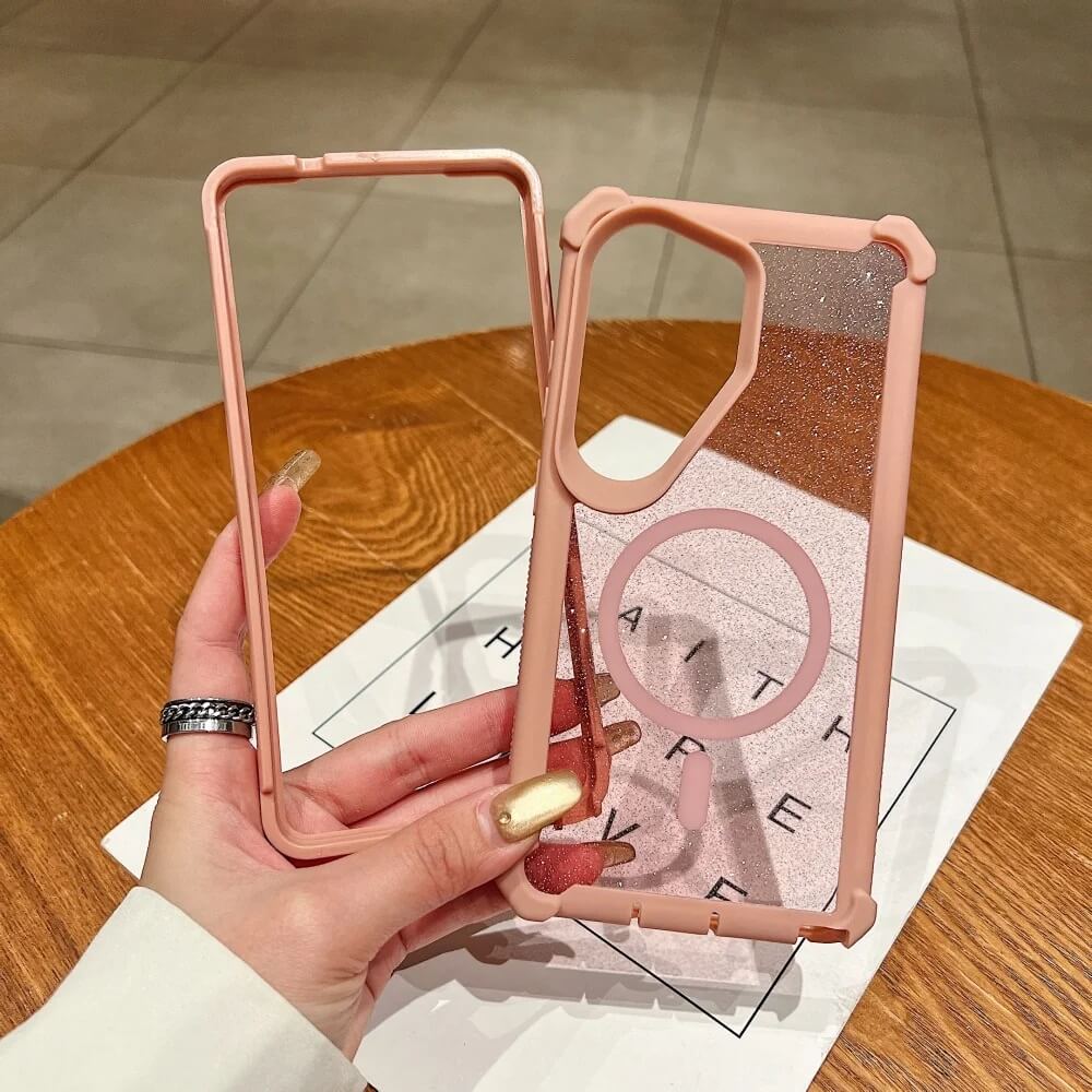 A transparent glitter panel sits beneath a matte bumper frame, creating a layered design that reflects light while keeping the phone visible underneath. A built-in magnetic ring is embedded in the back panel, aligning the case with magnetic chargers and compatible accessories. Around the camera area, a raised protective surround follows the multi-lens layout to shield the lenses from direct contact with flat surfaces.