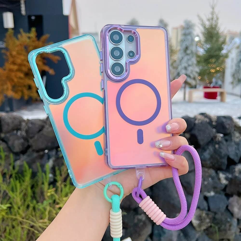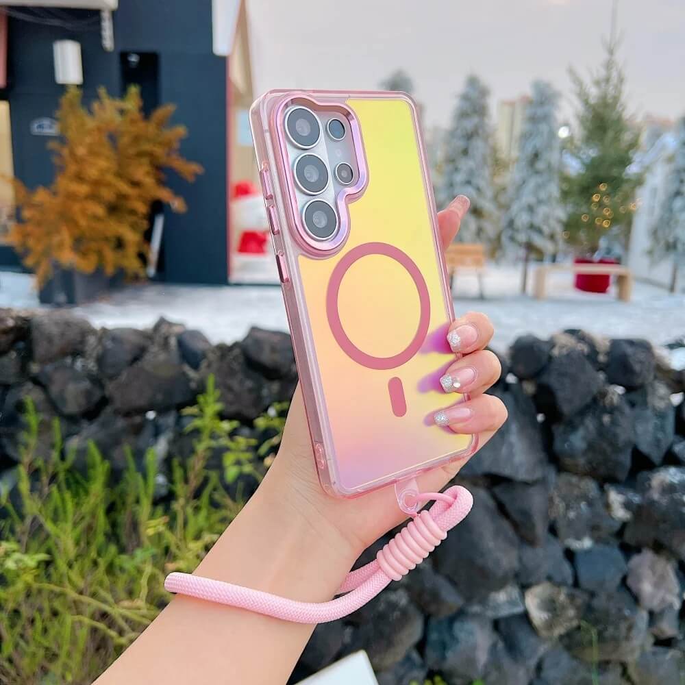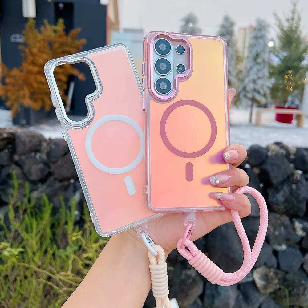 This iridescent magnetic case reflects pink, purple, and silver tones depending on light angle. A centered magnetic ring is integrated into the back panel and aligns securely with magnetic chargers and mounts.