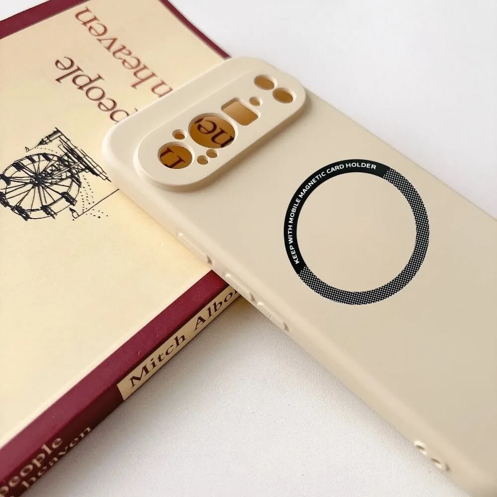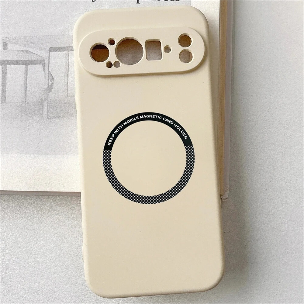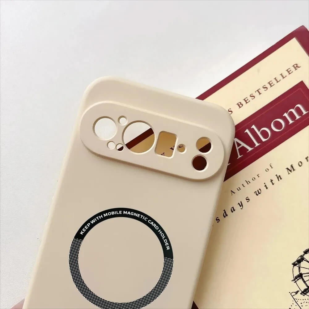 This liquid silicone matte case fits Google Pixel 10, 10 Pro, and 10 Pro XL. The exterior is smooth and uniform, finished in solid color with an integrated magnetic ring set into the back panel. A single molded camera frame spans the upper section, following the Pixel camera bar with precise, clean cutouts.
