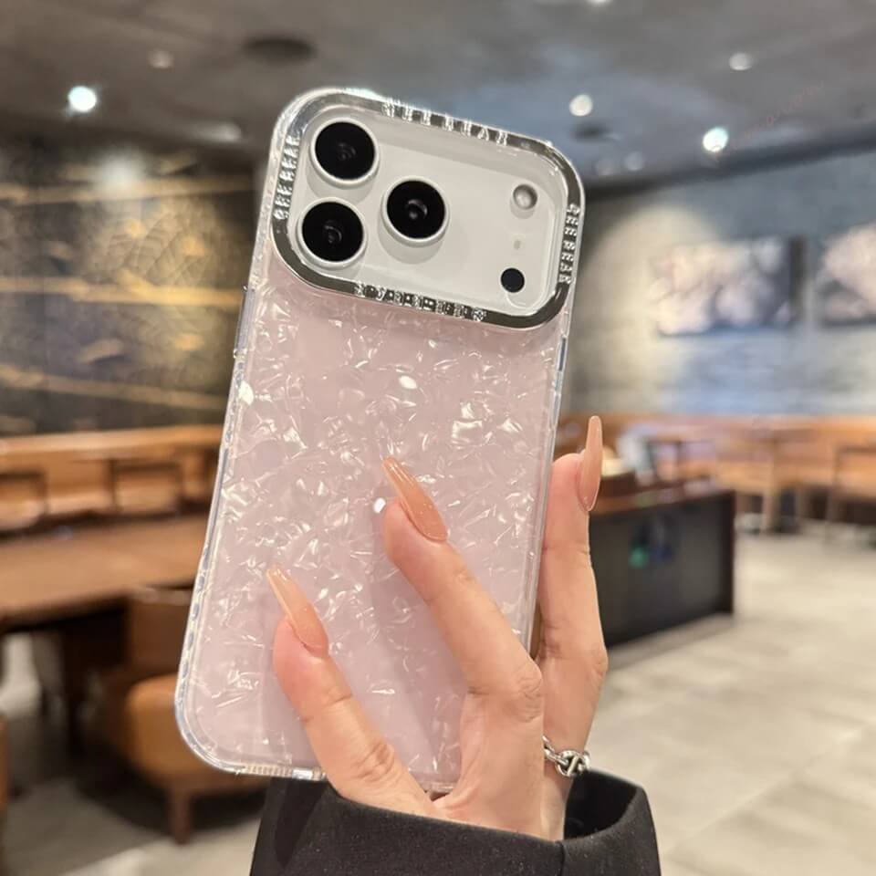 Our case brings a polished pearl-crystal look that instantly changes how the iPhone feels in your hand. The cracked-ice finish catches light with soft, shifting reflections that move with every angle, giving the phone a clean, luminous texture without hiding its shape. The transparent edges keep the profile light and modern while letting the design stay the focus.