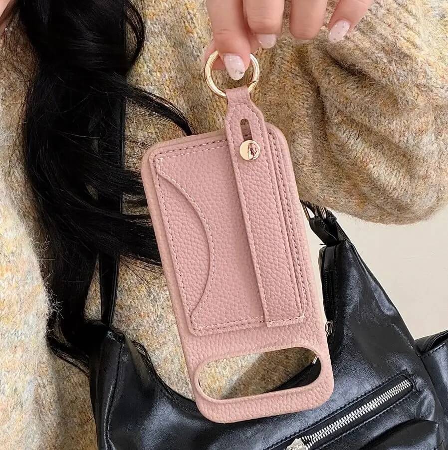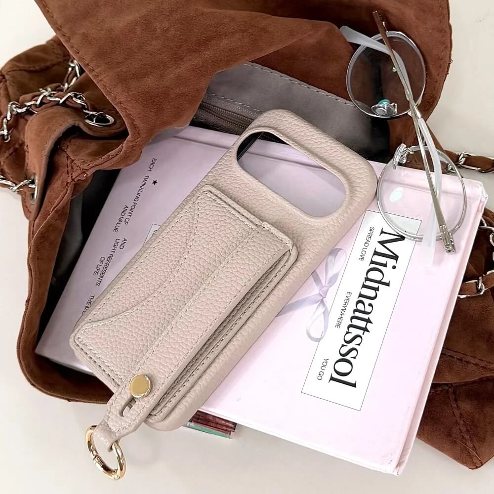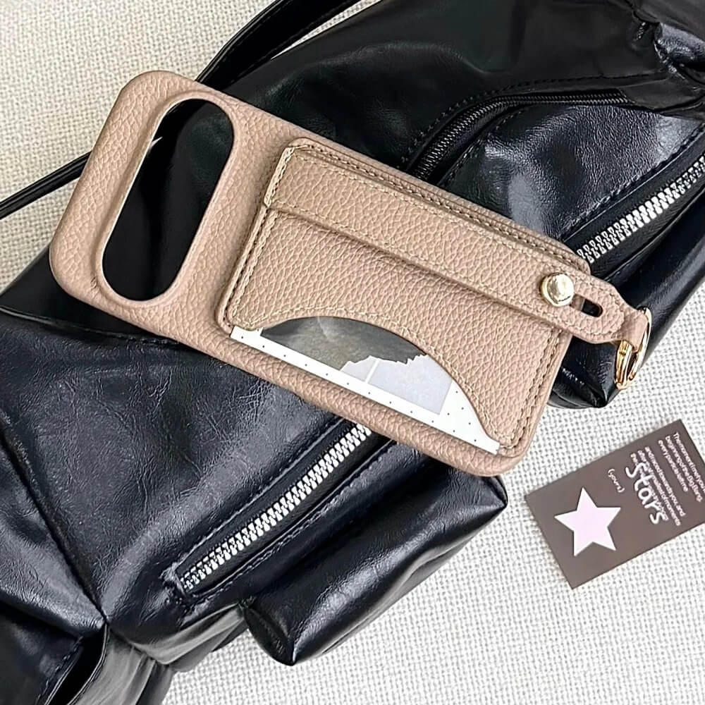 This wallet case with a strap wraps the Pixel in a pebbled leather finish that looks like a mini handbag in your hand. The back panel holds a slim card pocket with a curved cutout, stitched cleanly into the matte surface so it stays flat against the phone.