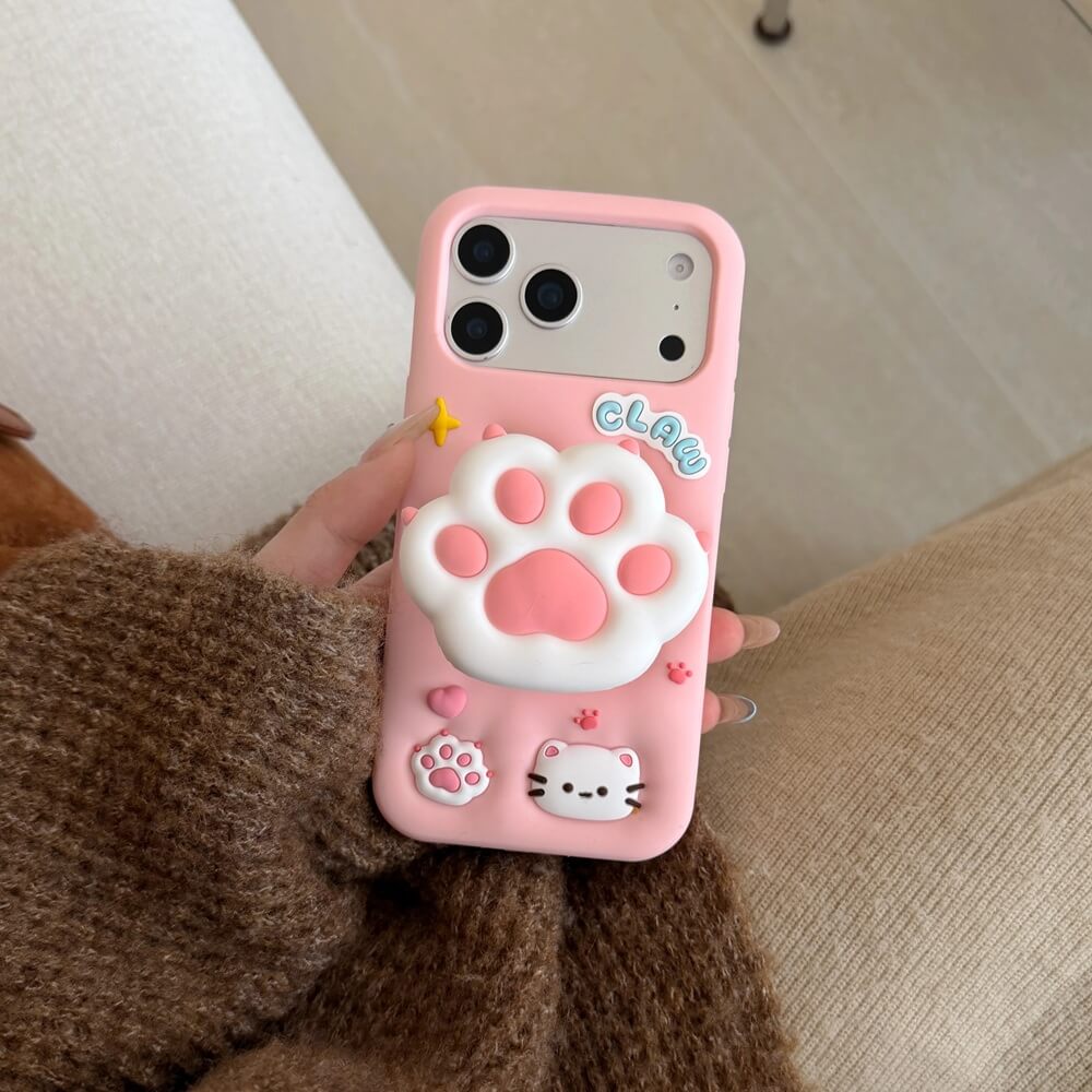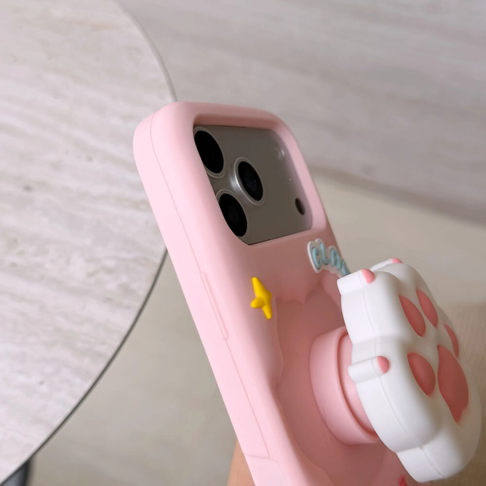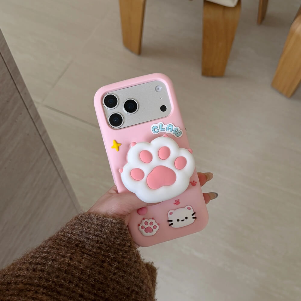 The raised cat paw functions as a fixed grip and rear support. Its padded shape provides a stable hold during use and forms a natural contact point when the phone is placed on a flat surface.