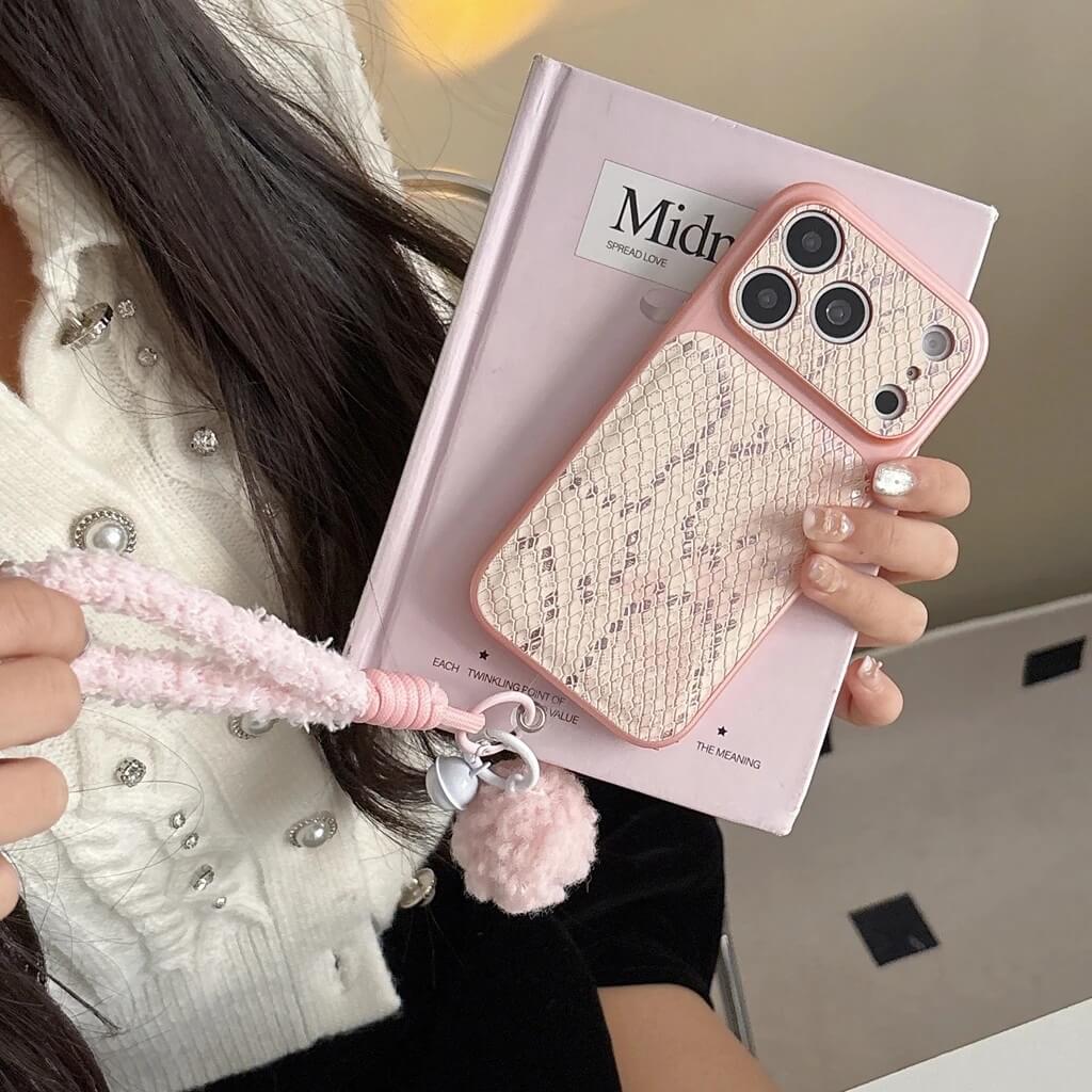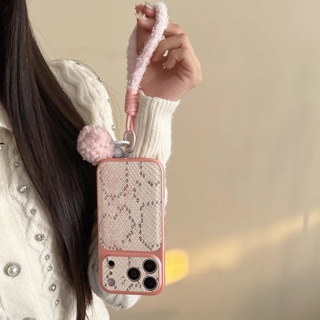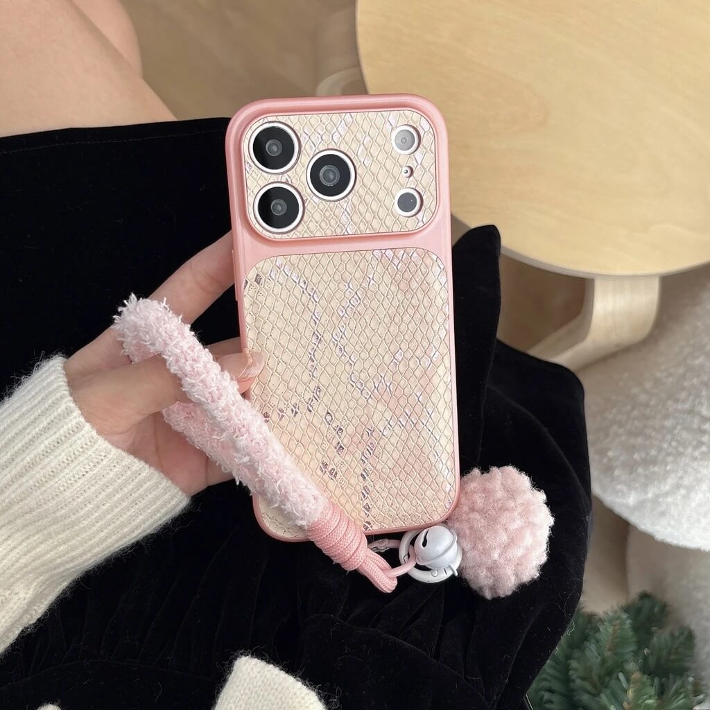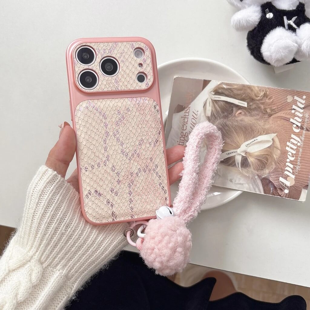 Features: Snake skin texture back, plush chenille wrist strap, pom pom charm, bell pendant, metal clip attachment, covered buttons, precise cutouts